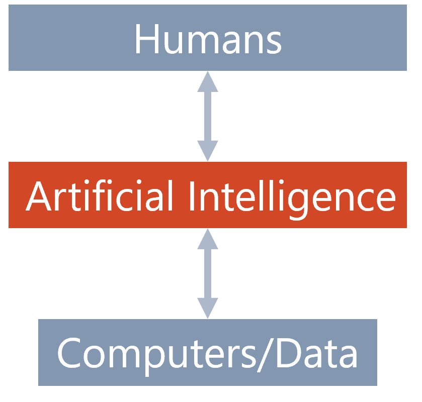 People are inherently human, while AI remains fundamentally a computer system with a model that enables communication between humans and machines. The graphic below illustrates AI’s role as an interface between humans and computers. While technically AI is a subset of computers, and not a separate entity, bear with me for a moment.