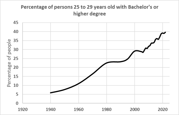 During this dramatic shift over the past 100 years the amount of people that are college educated in the United States has gone from a few percent to almost 40% of 25 to 29 year olds in 2022. This means that the workforce is more highly educated and informed than ever before. The educated workforce now has the ability to make informed and science-based decisions. This has resulted in faster technology implementation and adoption.