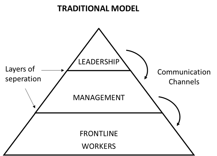 The traditional model has been those at the top of an organization, which we call Leadership, then middle Management, lastly the Frontline Workers. Information flows from the top down, where leadership makes the decision, which informs Management. The job of Management is to implement the decisions of Leadership, thereby Managing the Frontline Workers. There are layers of separation where key decisions must go up the chain of command, then back down through the chain before moving forward. Each layer is granted authority by the layer above. Anyone who has worked in a large corporation will tell you that this is the case.
